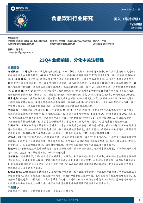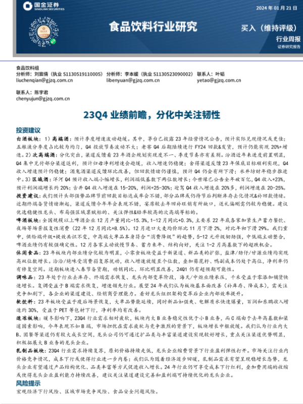 【国金证券】【20240121】20240121-国金证券-食品饮料行业研究:23Q4业绩前瞻,分化中关注韧性-13页