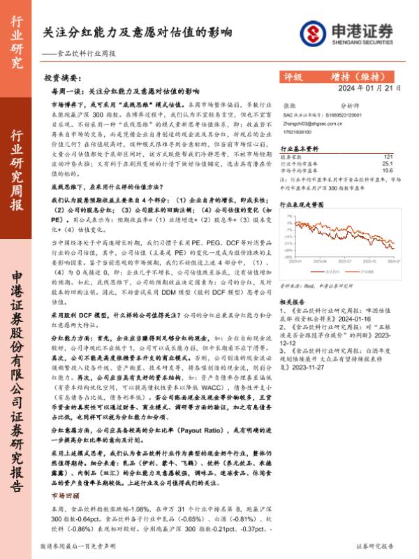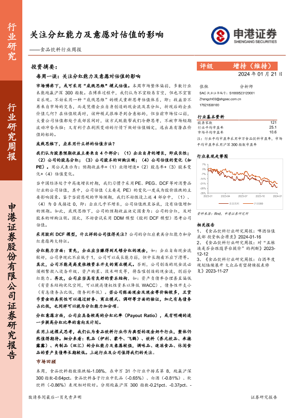 【申港证券】【20240121】20240121-申港证券-食品饮料行业周报:关注分红能力及意愿对估值的影响-22页