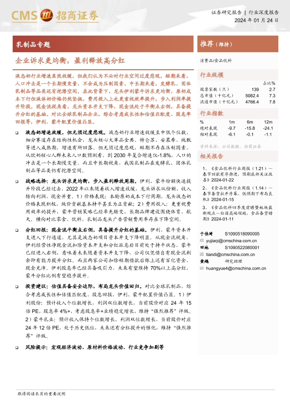 【海通证券】【20240124】20240124-招商证券-乳制品专题:企业诉求更均衡,盈利释放高分红-20页