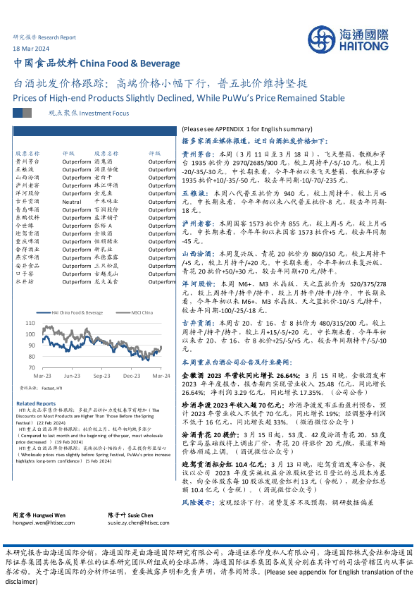 【海通国际】【20240318】白酒批发价格跟踪:高端价格小幅下行,普五批价维持坚挺-12页