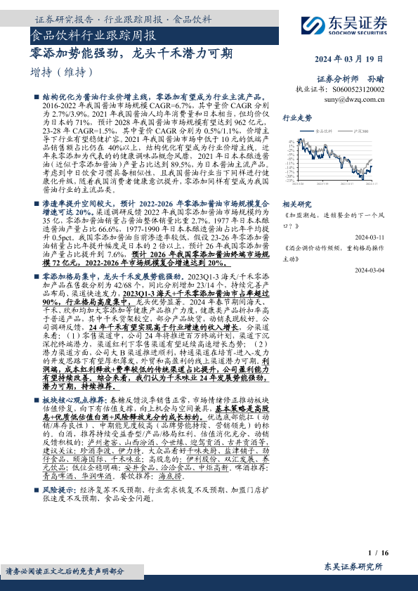 【东吴证券】【20240319】食品饮料行业跟踪周报:零添加势能强劲,龙头千禾潜力可期-16页