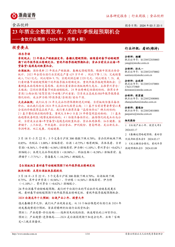 【浙商证券】【20240323】2024年3月第4期食饮行业周报:23年酒业全数据发布,关注年季报超预期机会-14页