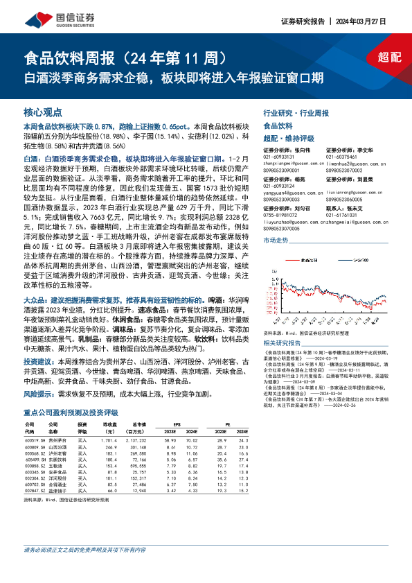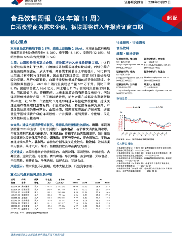 【国信证券】【20240327】20240327-国信证券-食品饮料周报(24年第11周):白酒淡季商务需求企稳,板块即将进入年报验证窗口期-21页