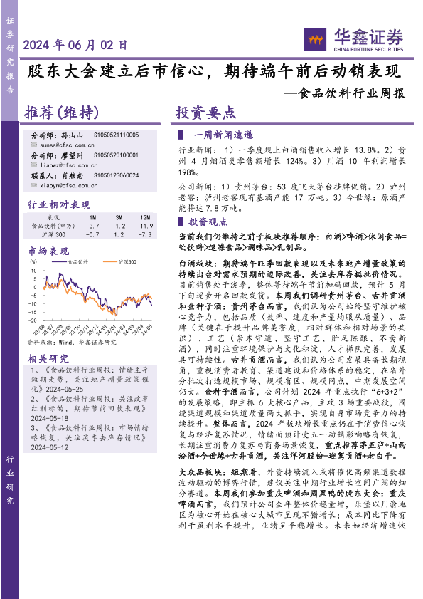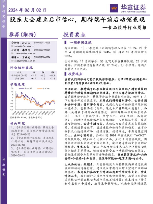 【华鑫证券】【20240602】食品饮料行业周报:股东大会建立后市信心,期待端午前后动销表现-20页