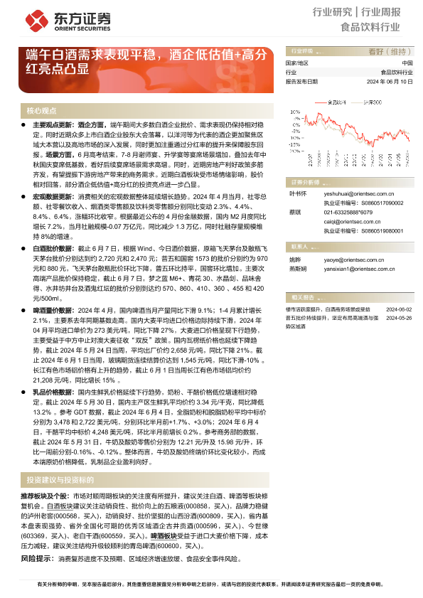 【东方证券】【20240610】20240610-东方证券-食品饮料行业周报:端午白酒需求表现平稳,酒企低估值+高分红亮点凸显-11页