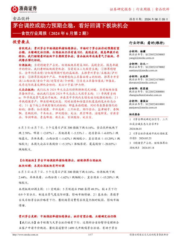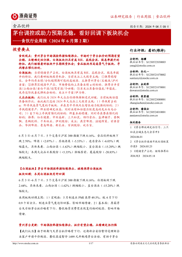 【浙商证券】【20240609】20240609-浙商证券-食饮行业周报(2024年6月第2期):茅台调控或助力预期企稳,看好回调下板块机会-17页