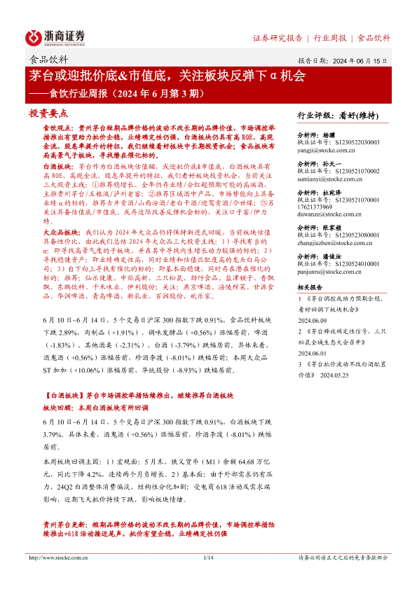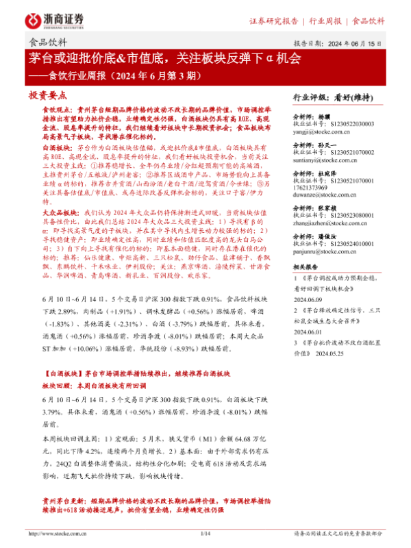 【浙商证券】【20240615】食饮行业周报(2024年6月第3期):茅台或迎批价底&市值底,关注板块反弹下α机会-14页