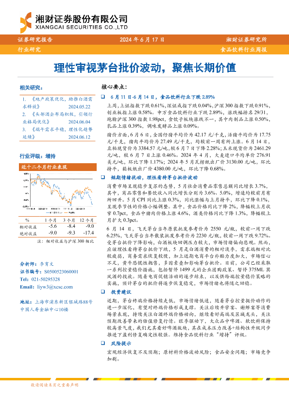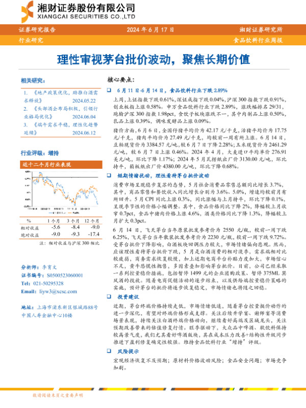 【湘财证券】【20240617】20240617-湘财证券-食品饮料行业周报:理性审视茅台批价波动,聚焦长期价值-10页