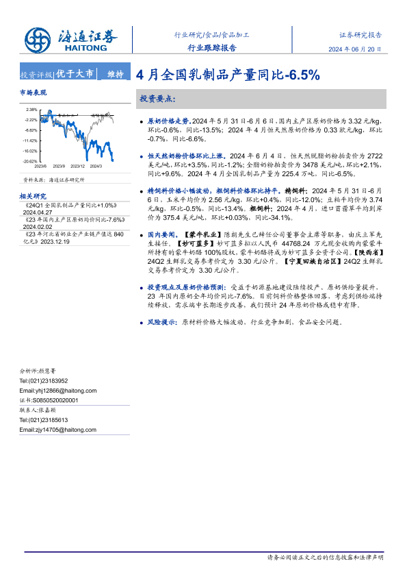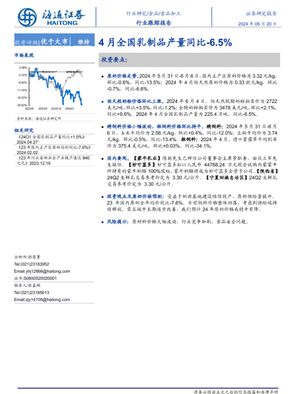 【海通证券】【20240620】20240620-海通证券-食品加工行业跟踪报告:4月全国乳制品产量同比-6.5%-10页