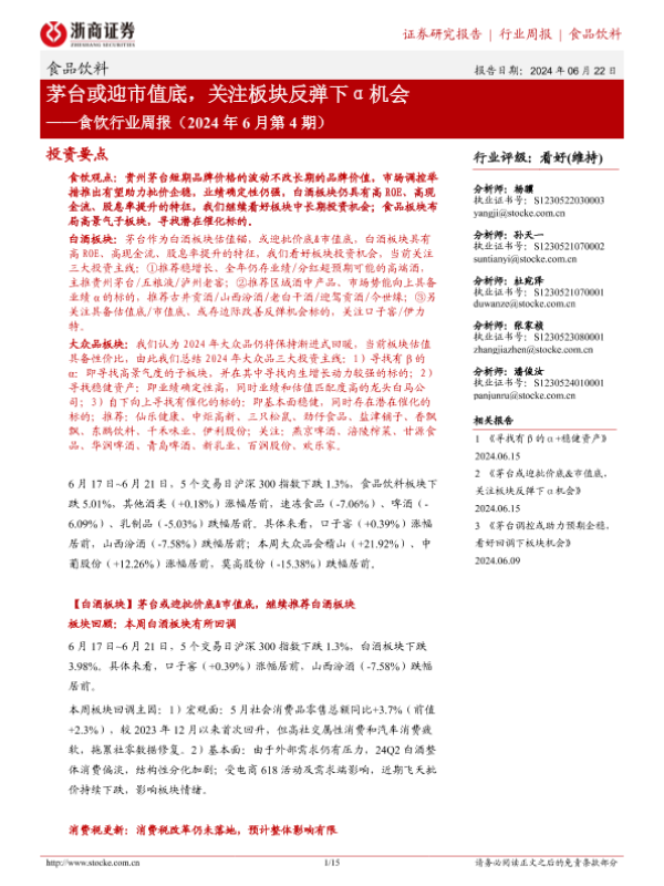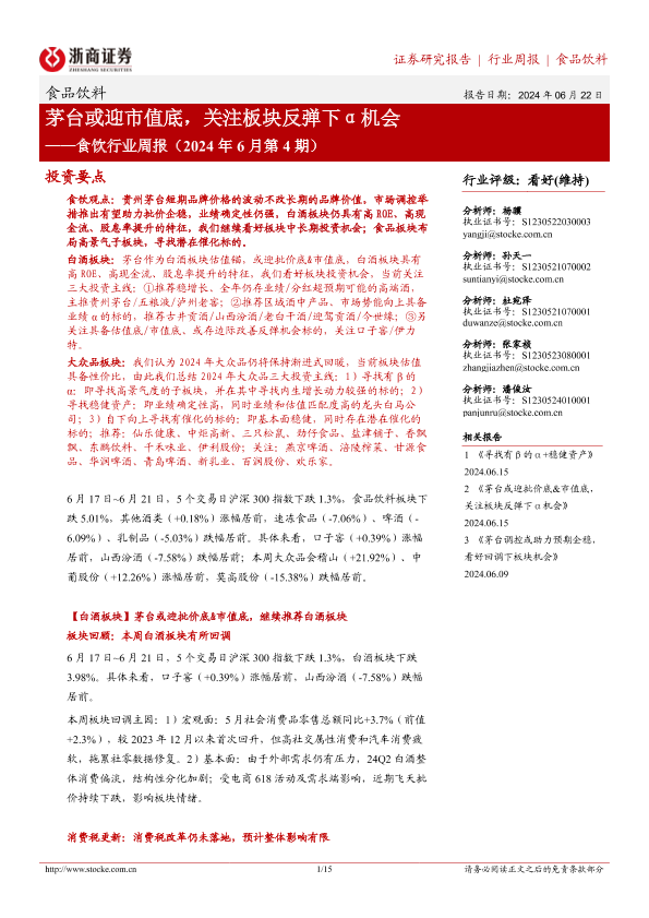 【浙商证券】【20240622】食饮行业周报(2024年6月第4期):茅台或迎市值底,关注板块反弹下α机会-15页