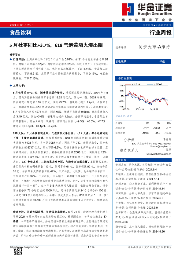 【华金证券】【20240623】食品饮料行业周报:5月社零同比+3.7%,618气泡黄酒火爆出圈-14页