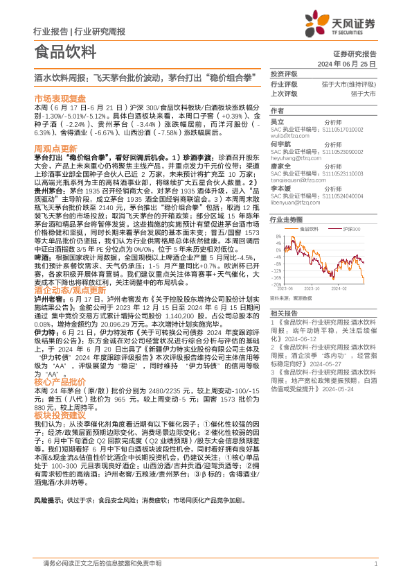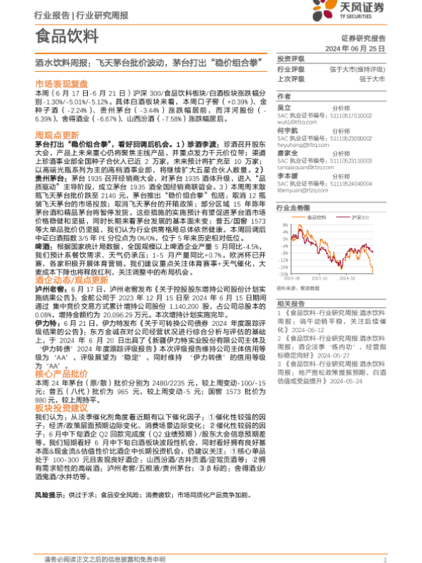 【天风证券】【20240625】食品饮料行业酒水饮料周报:飞天茅台批价波动,茅台打出“稳价组合拳”-17页