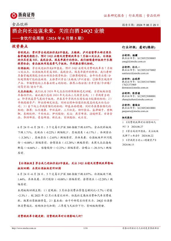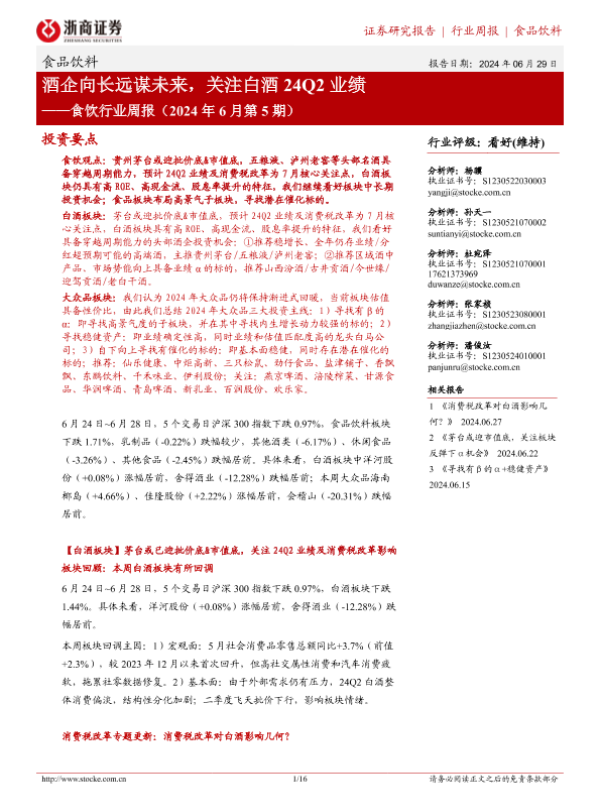 【浙商证券】【20240629】食饮行业周报(2024年6月第5期):酒企向长远谋未来,关注白酒24Q2业绩-16页