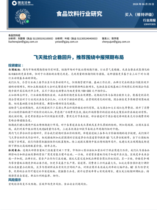 【国金证券】【20240629】20240629-国金证券-食品饮料行业周报:飞天批价企稳回升,推荐围绕中报预期布局-11页