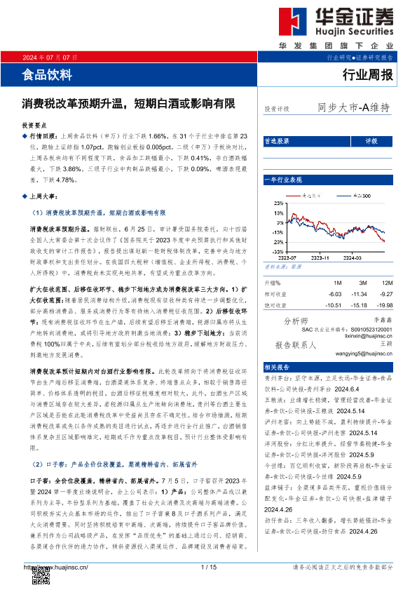 【华金证券】【20240707】食品饮料行业周报:消费税改革预期升温,短期白酒或影响有限-15页