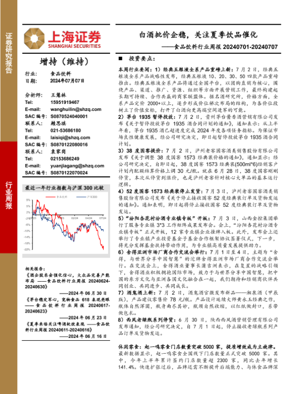 【上海证券】【20240707】20240707-上海证券-食品饮料行业周报:白酒批价企稳,关注夏季饮品催化-20页
