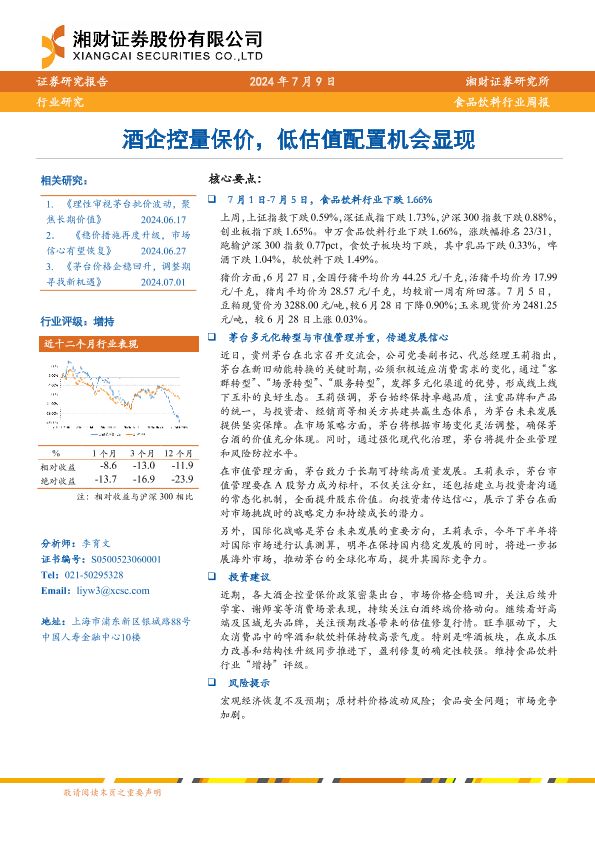 【湘财证券】【20240709】20240709-湘财证券-食品饮料行业周报:酒企控量保价,低估值配置机会显现-10页