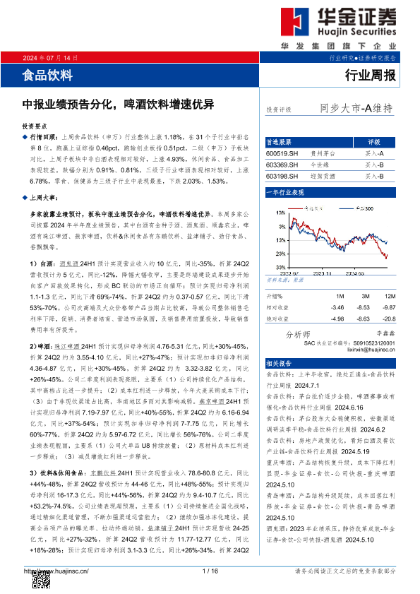 【华金证券】【20240714】食品饮料行业周报:中报业绩预告分化,啤酒饮料增速优异-16页