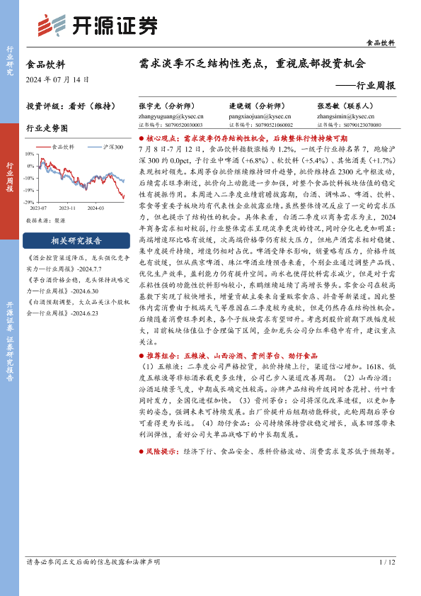 【开源证券】【20240714】20240714-食品饮料行业周报:需求淡季不乏结构性亮点,重视底部投资机会-12页