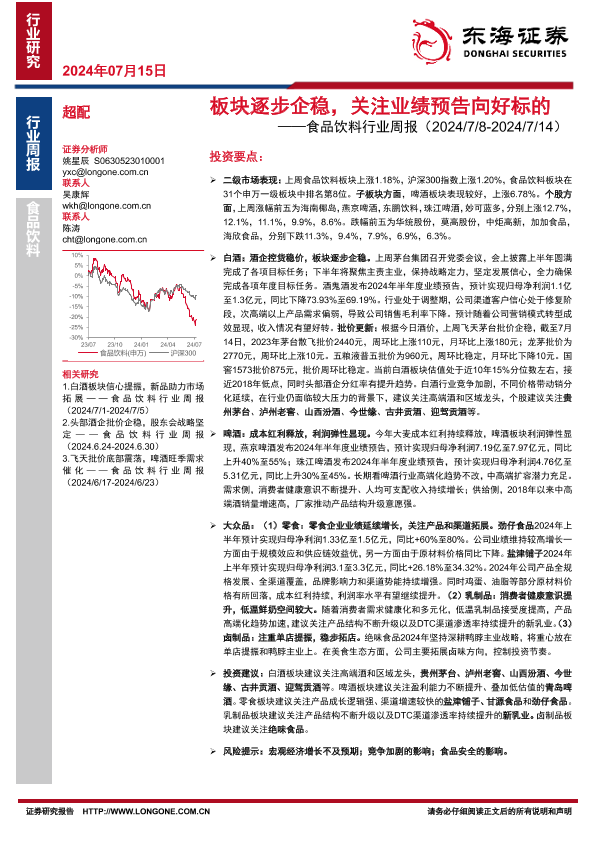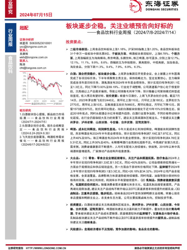 【东海证券】【20240715】20240715-东海证券-食品饮料行业周报:板块逐步企稳,关注业绩预告向好标的-10页