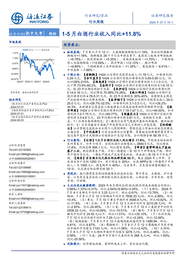 【海通证券】【20240715】20240715-海通证券-食品行业周报:1-5月白酒行业收入同比+11.8%-18页