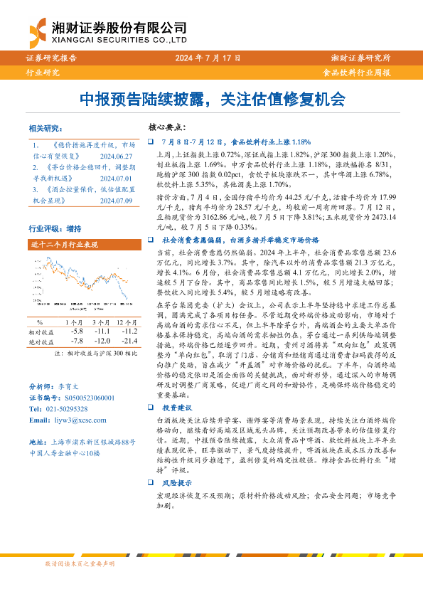 【湘财证券】【20240717】20240717-湘财证券-食品饮料行业周报:中报预告陆续披露,关注估值修复机会-11页