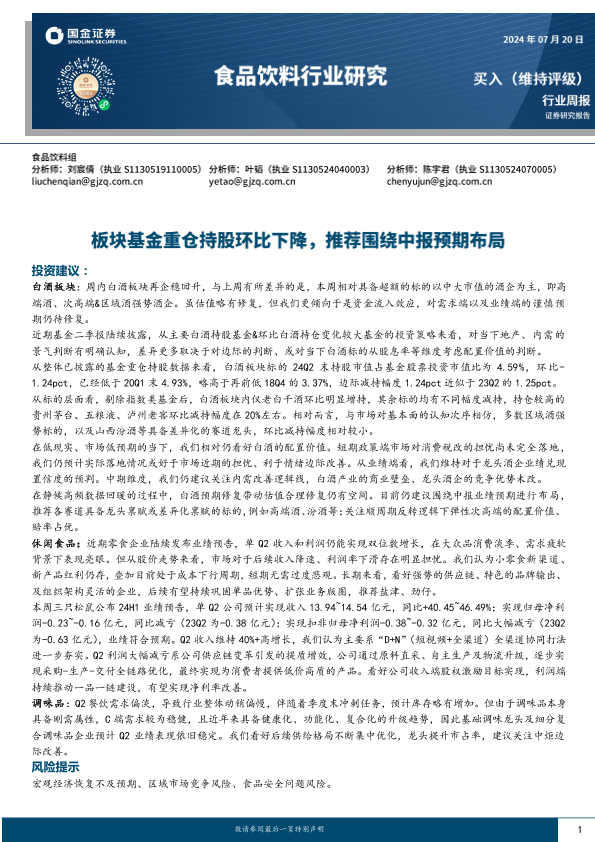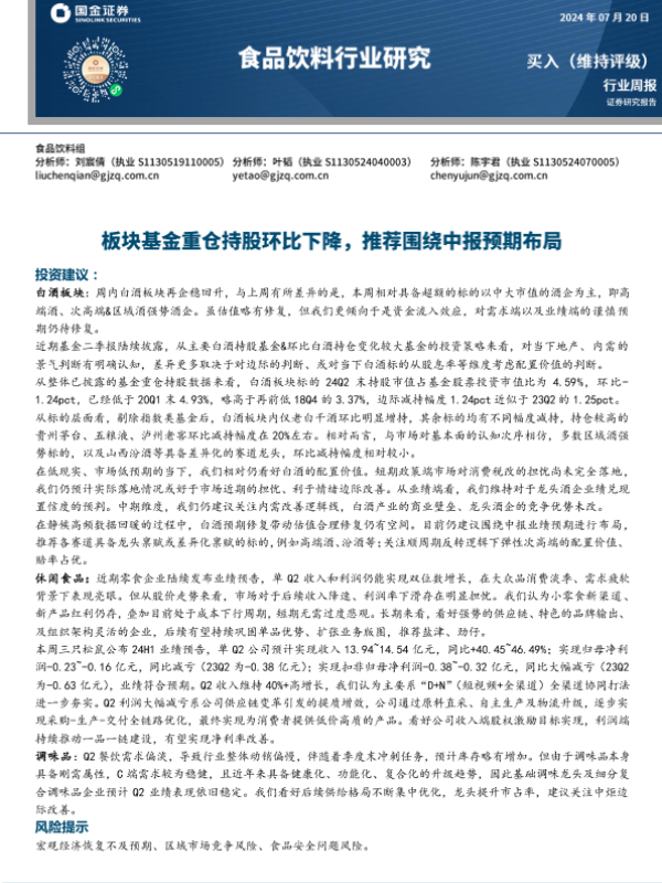 【国金证券】【20240720】20240720-国金证券-食品饮料行业研究:板块基金重仓持股环比下降,推荐围绕中报预期布局-11页
