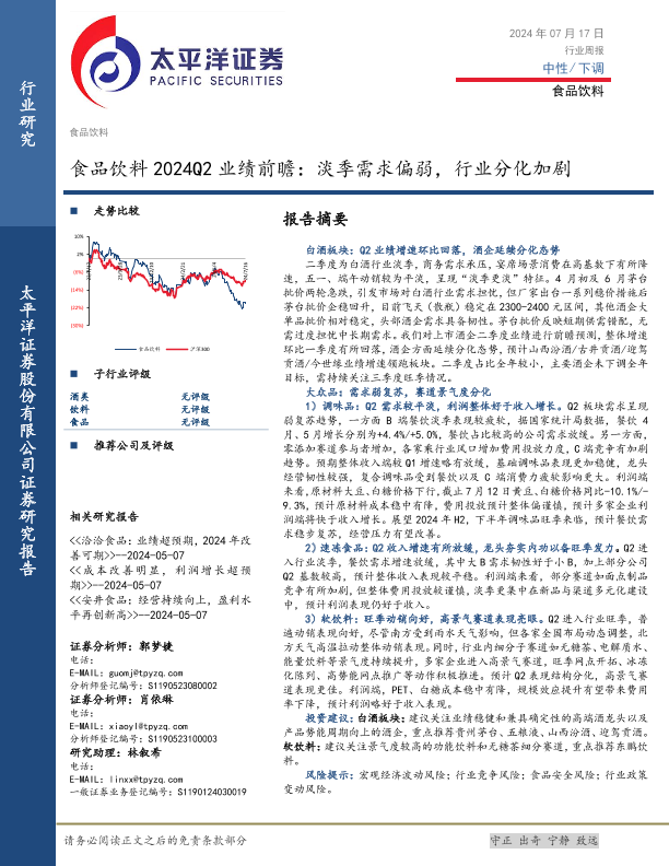【太平洋证券】【20240717】食品饮料2024Q2业绩前瞻:淡季需求偏弱,行业分化加剧-12页