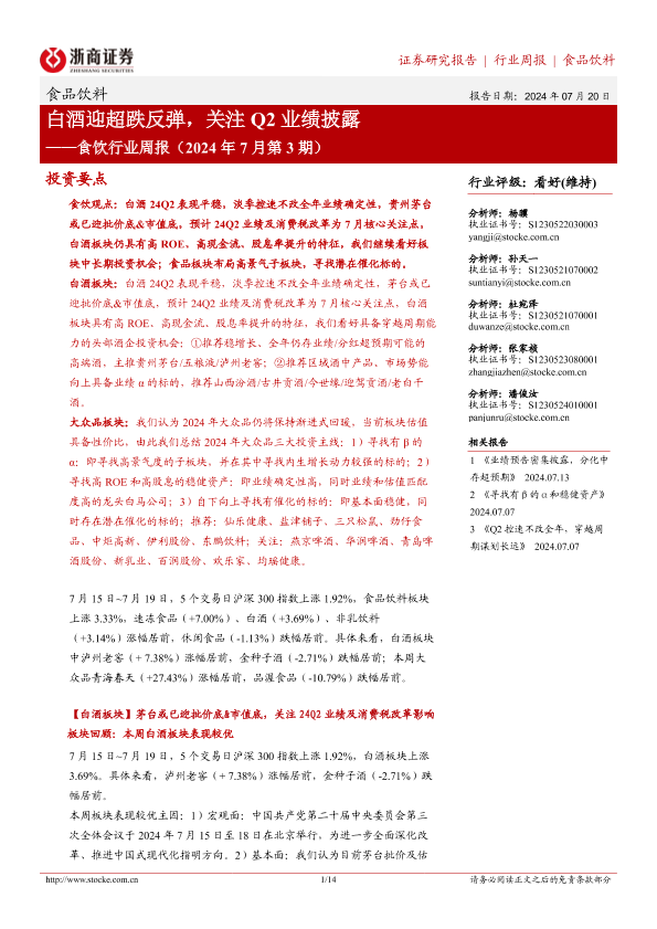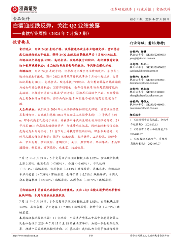 【浙商证券】【20240720】食饮行业周报(2024年7月第3期):白酒迎超跌反弹,关注Q2业绩披露-14页