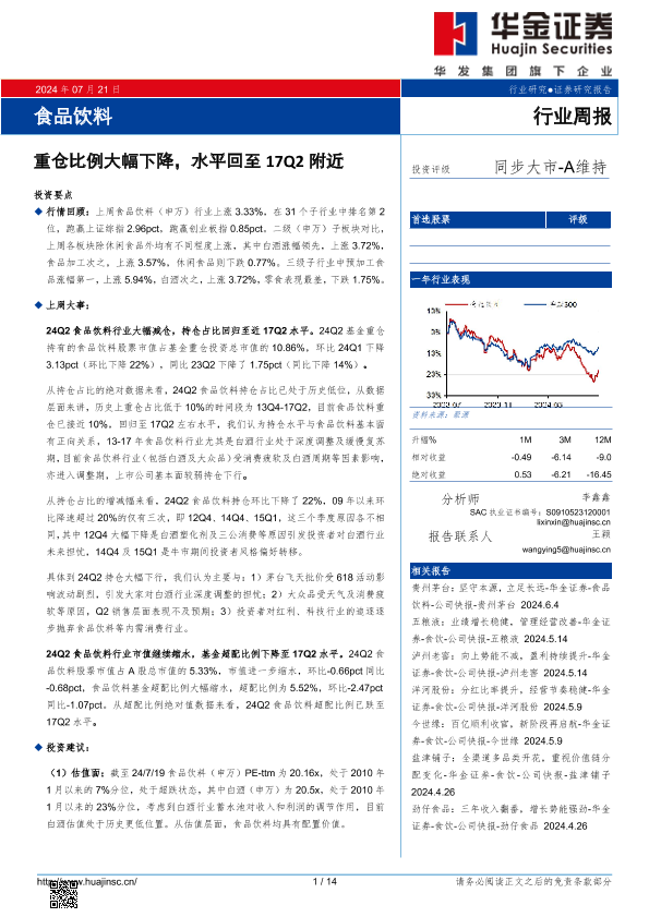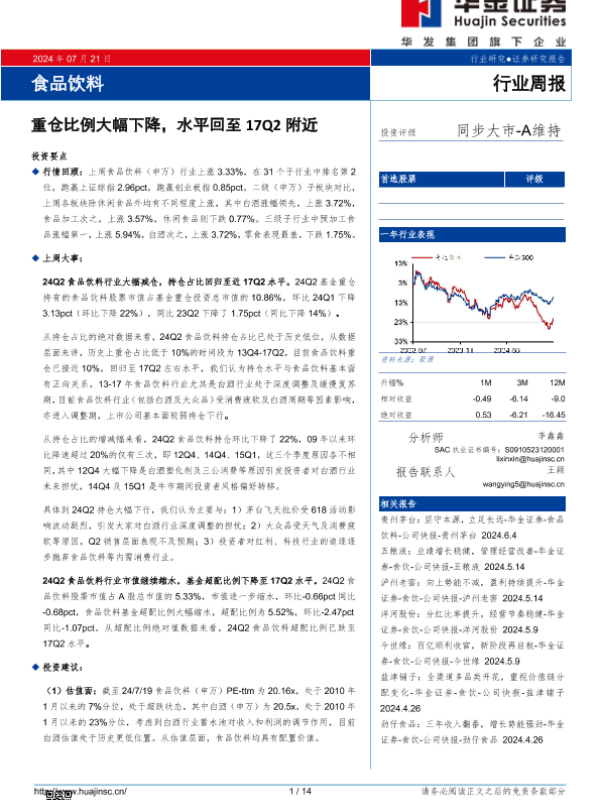 【华金证券】【20240721】食品饮料行业周报:重仓比例大幅下降,水平回至17Q2附近-14页