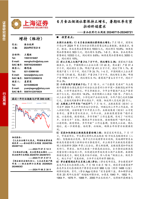 【上海证券】【20240721】20240721-上海证券-食品饮料行业周报:6月食品烟酒社零保持正增长,暑期旺季有望拉动终端需求-22页