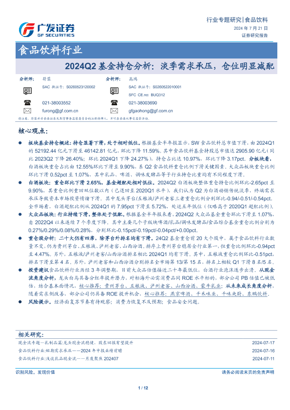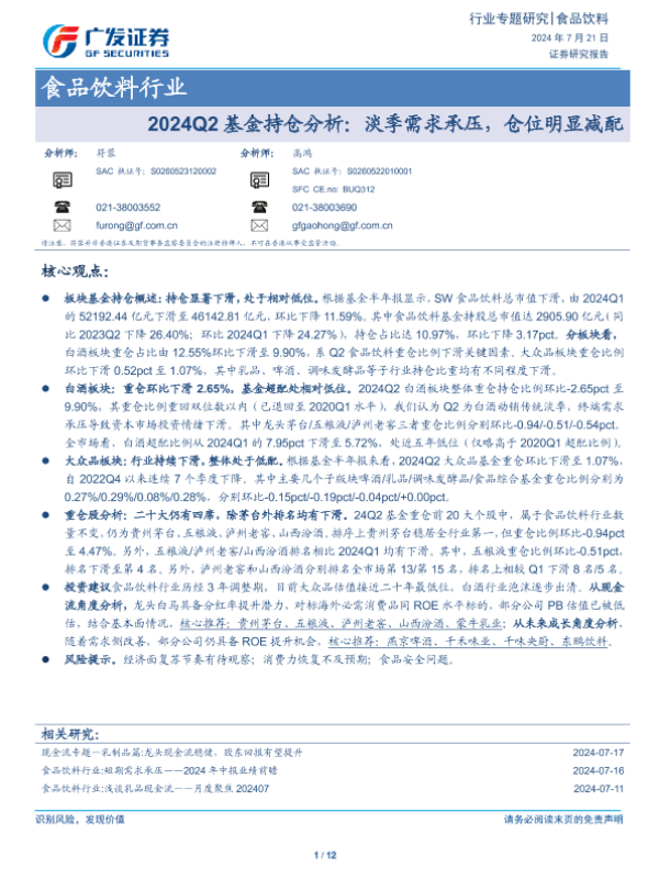 【广发证券】【20240721】2024Q2基金持仓分析:淡季需求承压,仓位明显减配-12页