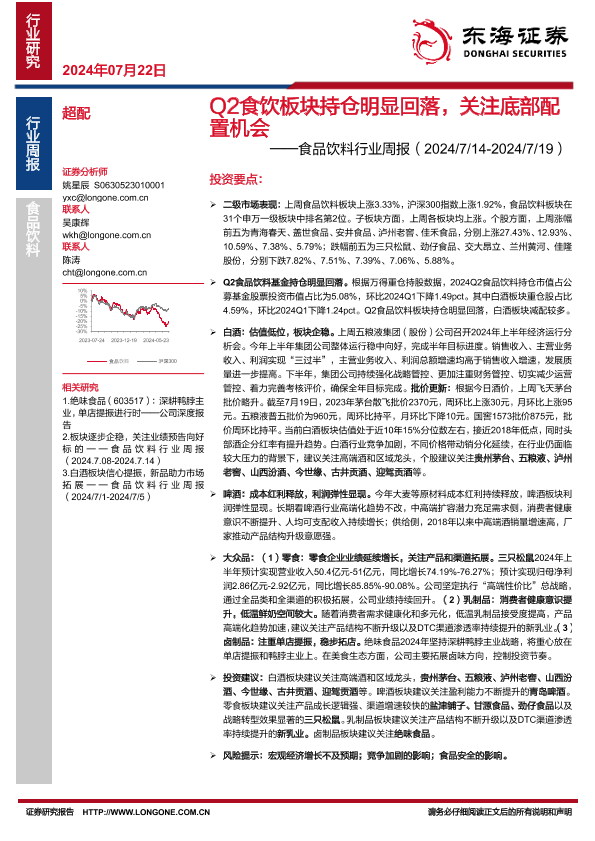 【东海证券】【20240722】20240722-东海证券-食品饮料行业周报:Q2食饮板块持仓明显回落,关注底部配置机会-10页
