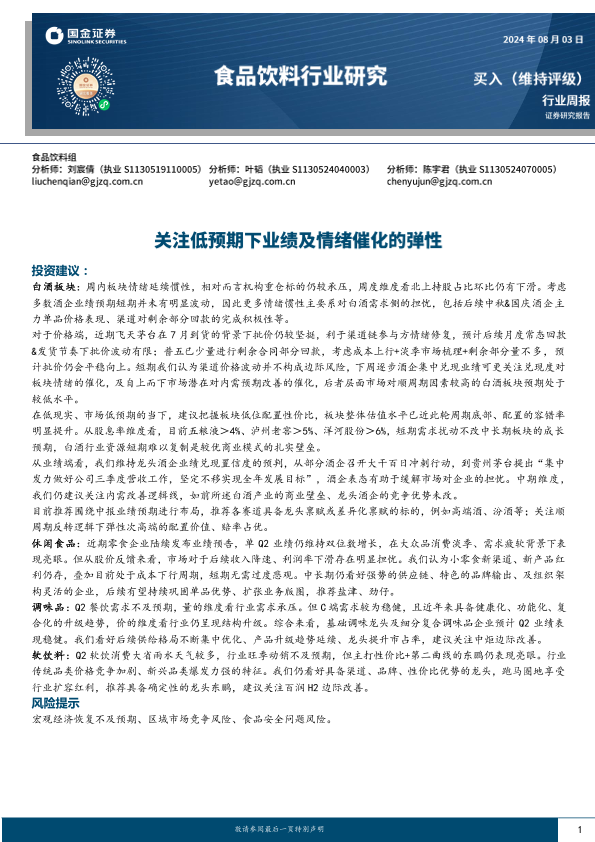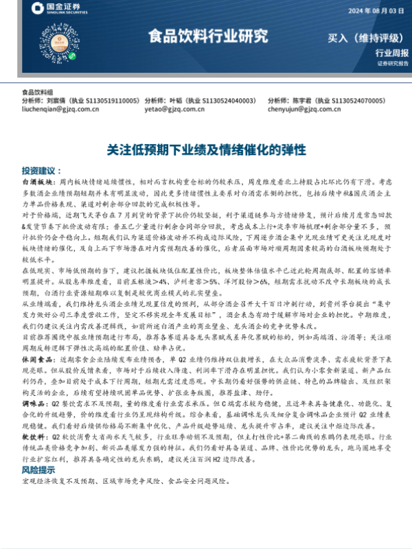 【国金证券】【20240803】20240803-国金证券-食品饮料行业研究:关注低预期下业绩及情绪催化的弹性-11页