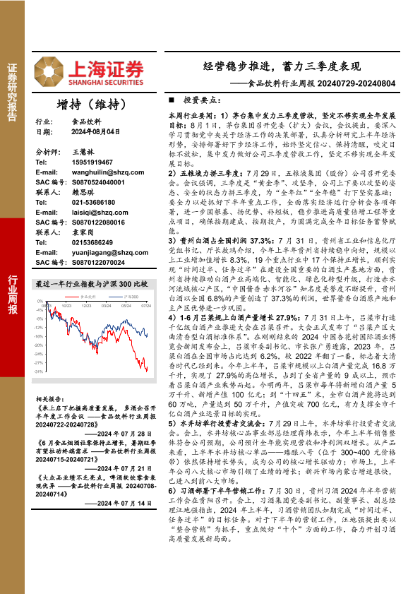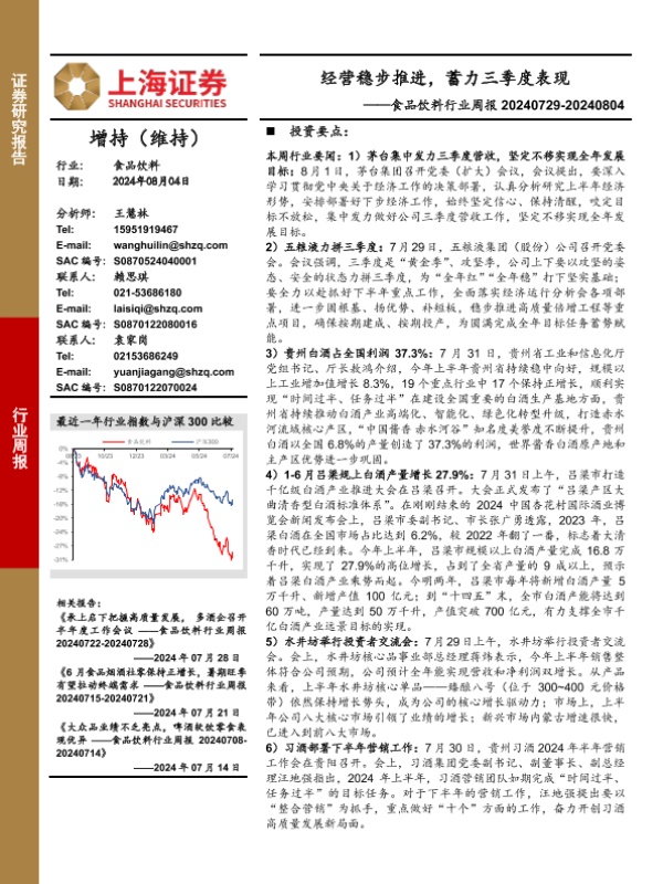【上海证券】【20240804】经营稳步推进,蓄力三季度表现——食品饮料行业周报 20240729-20240804-23页