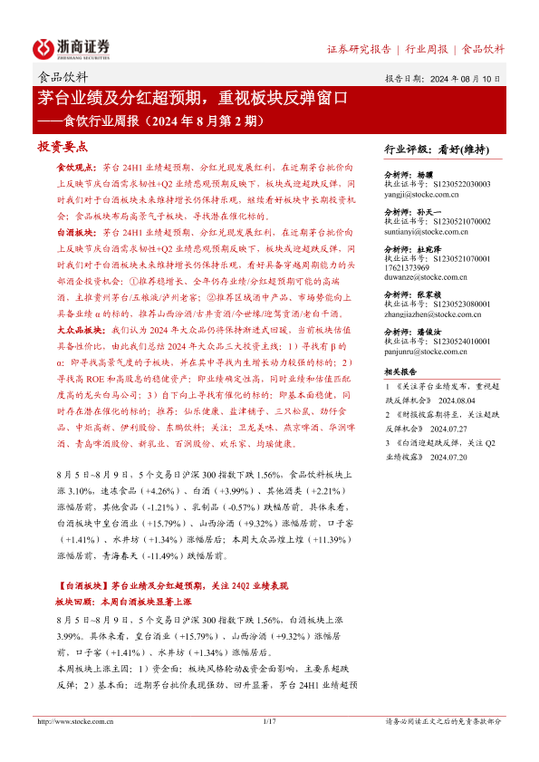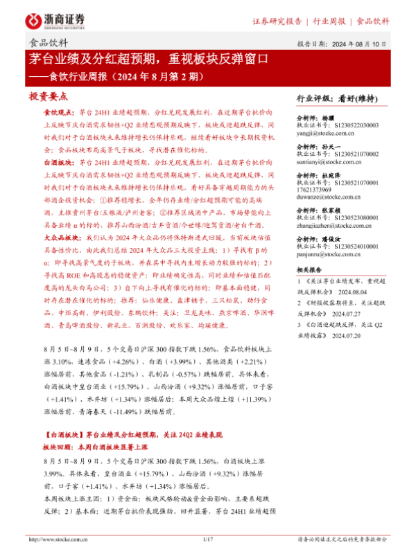 【浙商证券】【20240810】食饮行业周报(2024年8月第2期):茅台业绩及分红超预期,重视板块反弹窗口-17页