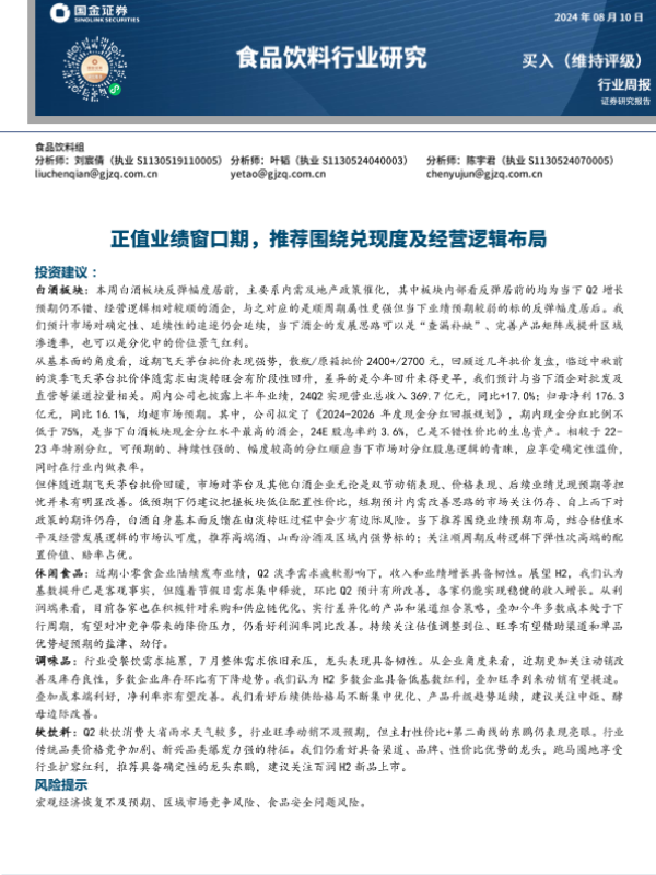【国金证券】【20240810】20240810-国金证券-食品饮料行业研究:正值业绩窗口期,推荐围绕兑现度及经营逻辑布局-11页