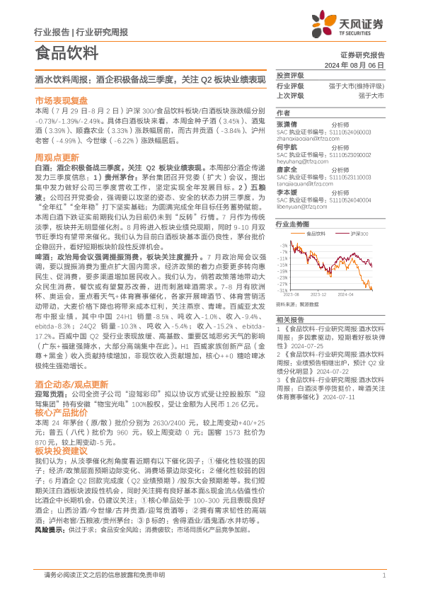 【天风证券】【20240806】食品饮料行业酒水饮料周报:酒企积极备战三季度,关注Q2板块业绩表现-14页