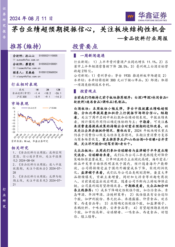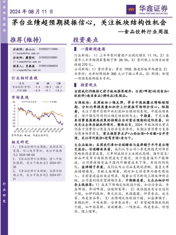 【华鑫证券】【20240811】20240811-华鑫证券-食品饮料行业周报:茅台业绩超预期提振信心,关注板块结构性机会-24页