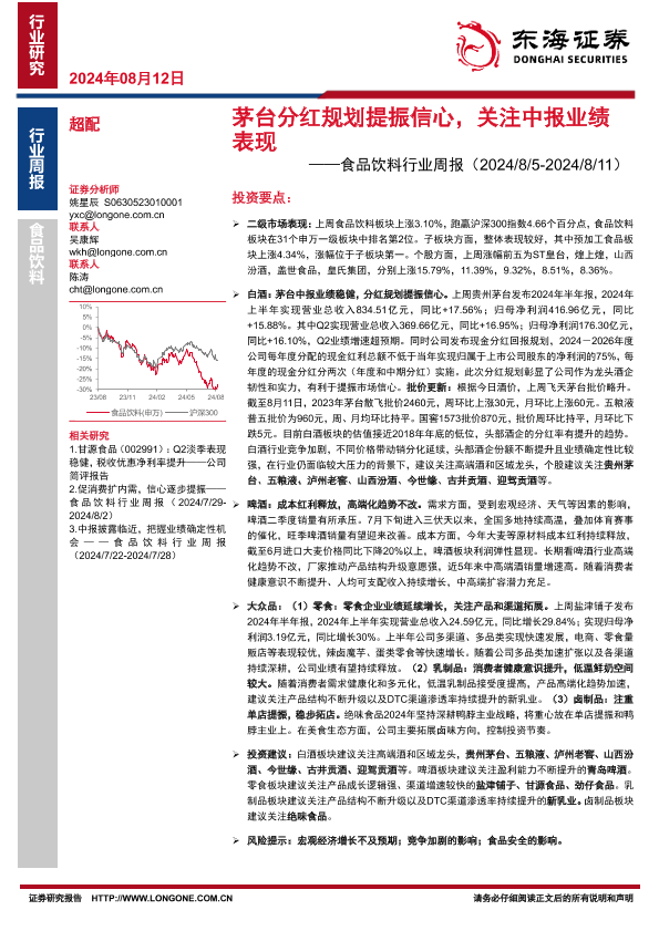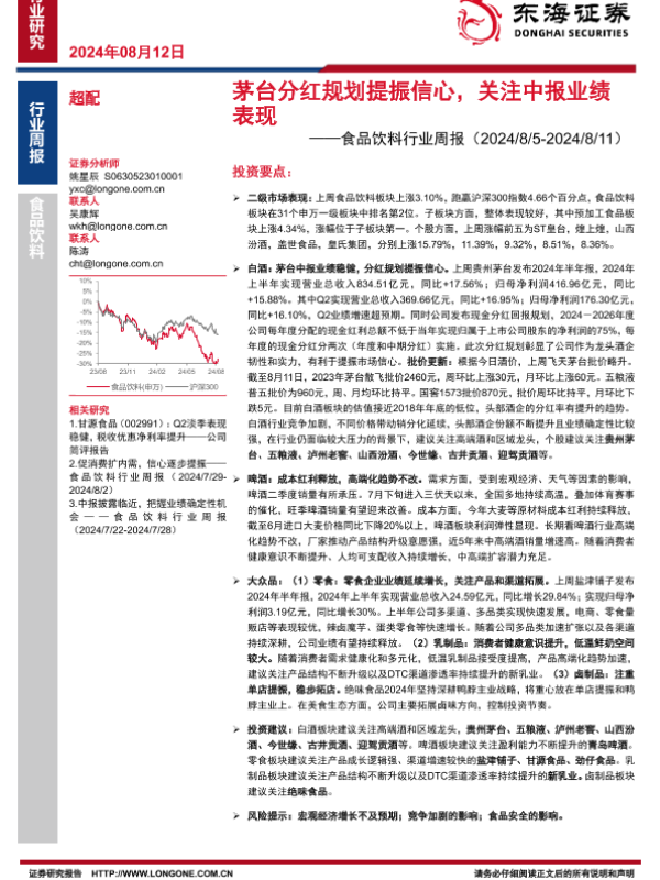 【东海证券】【20240812】20240812-东海证券-食品饮料行业周报:茅台分红规划提振信心,关注中报业绩表现-10页