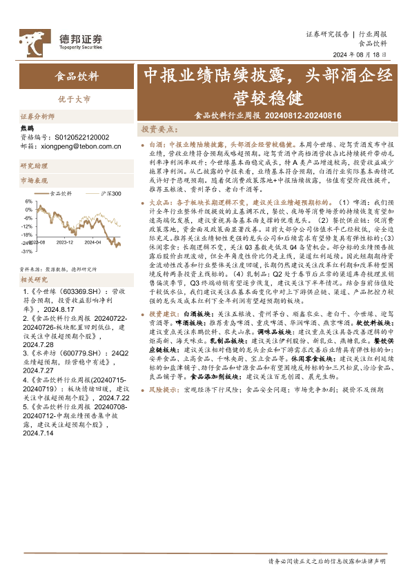 【德邦证券】【20240818】20240818-德邦证券-食品饮料行业周报:中报业绩陆续披露,头部酒企经营较稳健-16页