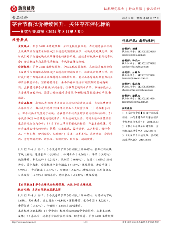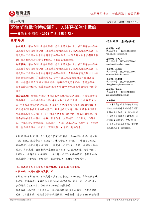 【浙商证券】【20240817】食饮行业周报(2024年8月第3期):茅台节前批价持续回升,关注存在催化标的-15页