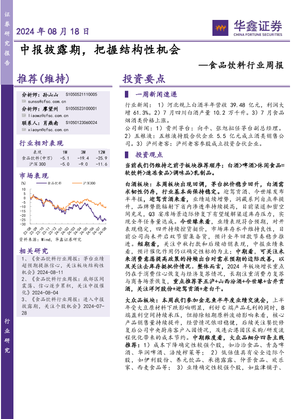 【华鑫证券】【20240818】20240818-华鑫证券-食品饮料行业周报:中报披露期,把握结构性机会-22页