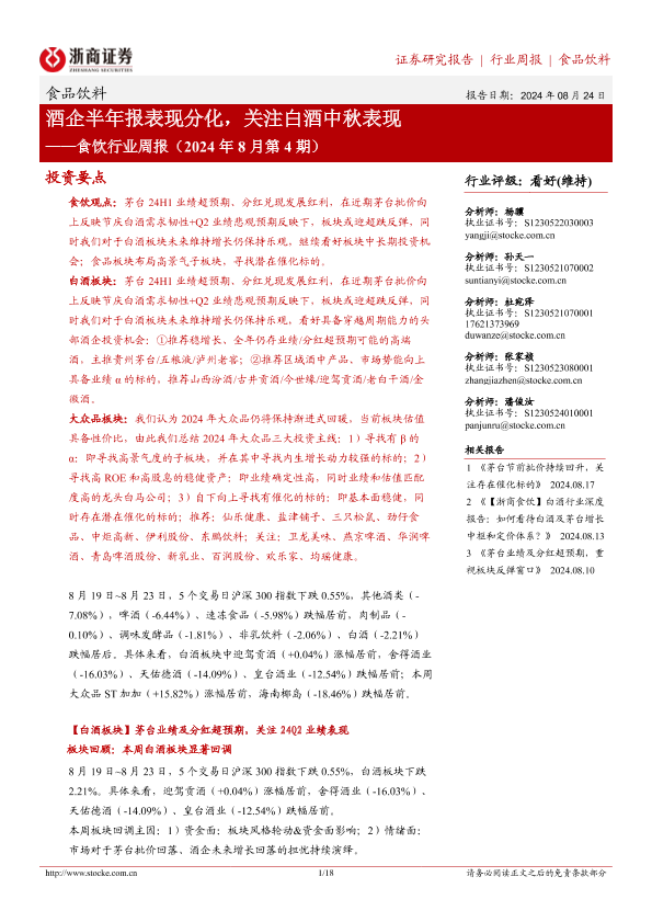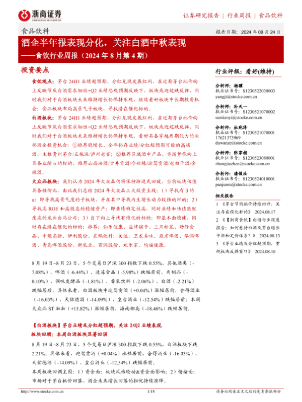 【浙商证券】【20240824】2024年8月第4期食饮行业周报:酒企半年报表现分化,关注白酒中秋表现-18页