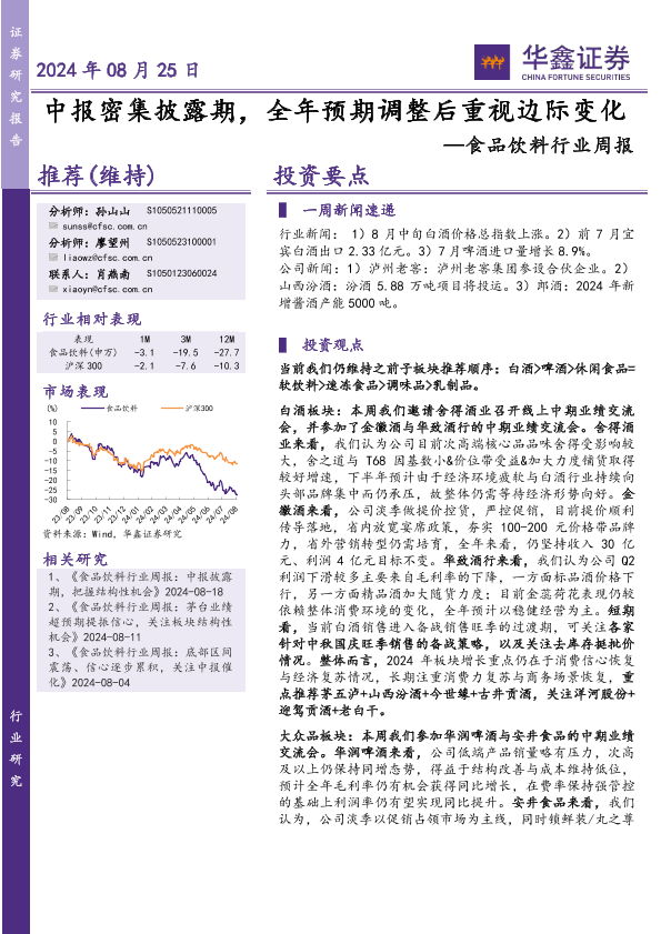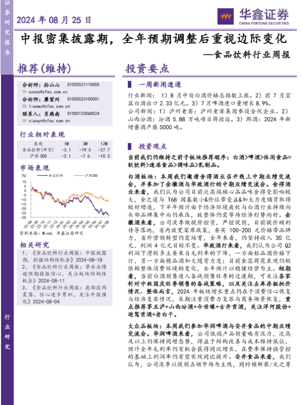 【华鑫证券】【20240825】20240825-华鑫证券-食品饮料行业周报:中报密集披露期,全年预期调整后重视边际变化-27页