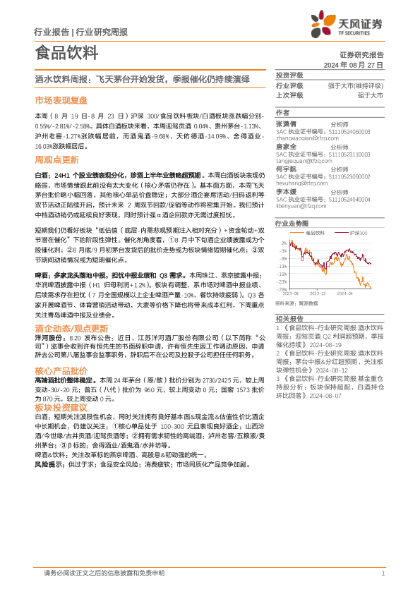 【天风证券】【20240827】食品饮料行业酒水饮料周报:飞天茅台开始发货,季报催化仍持续演绎-12页