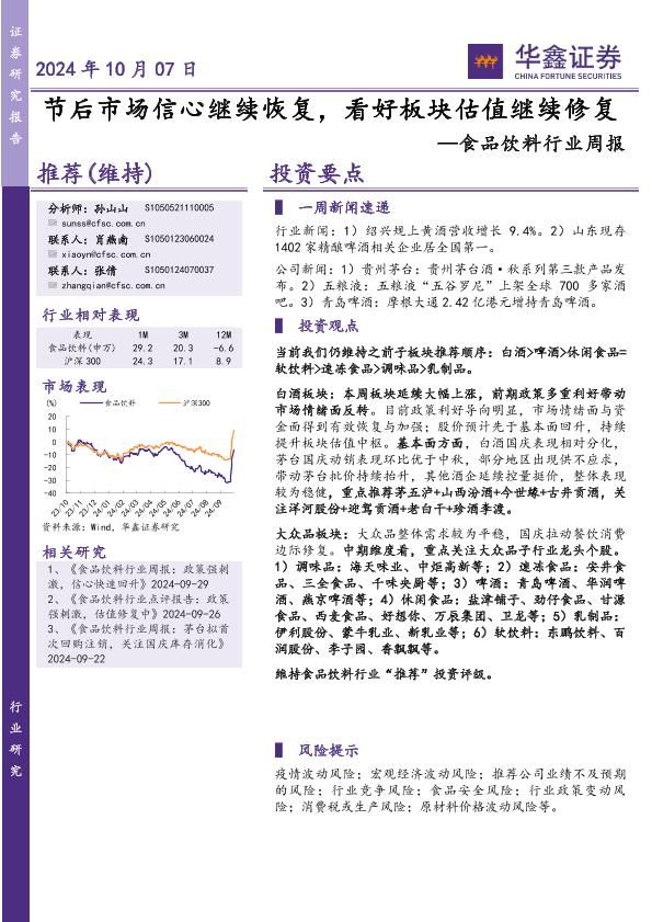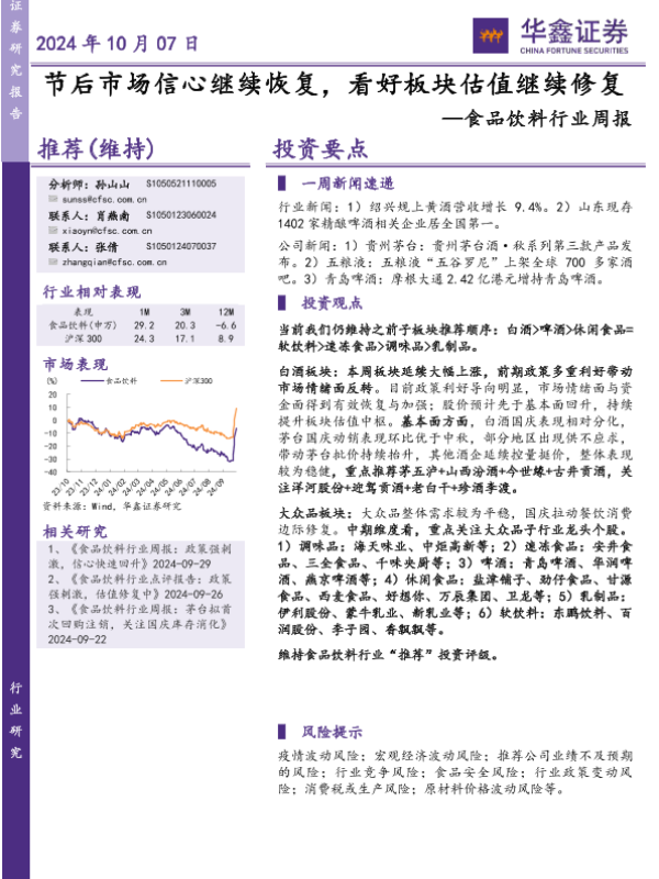 【华鑫证券】【20241007】20241007-华鑫证券-食品饮料行业周报:节后市场信心继续恢复,看好板块估值继续修复-17页