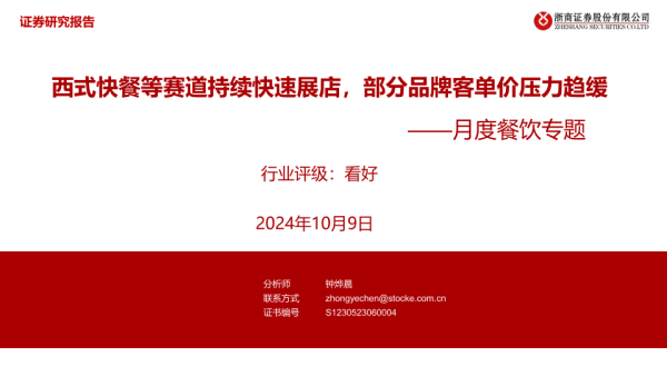 【浙商证券】【20241009】20241009-浙商证券-月度餐饮专题:西式快餐等赛道持续快速展店,部分品牌客单价压力趋缓-10页