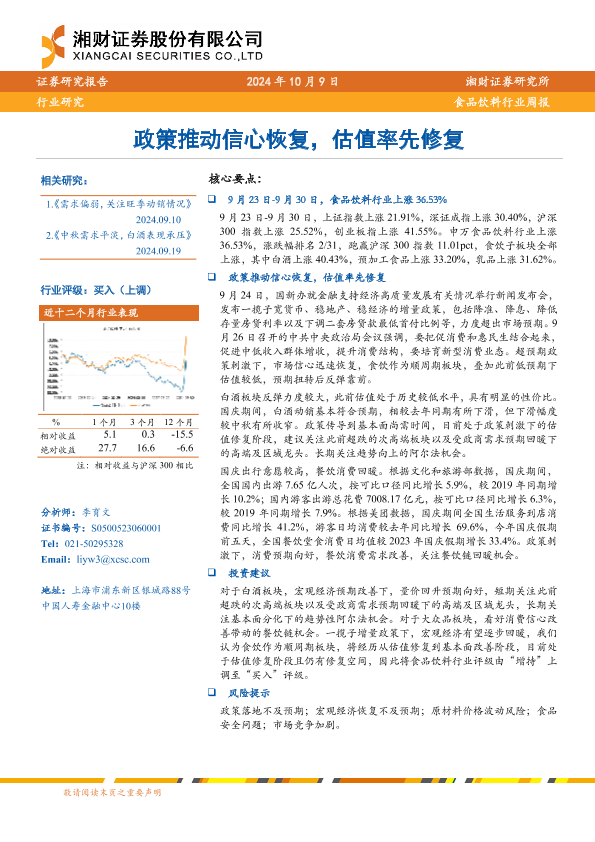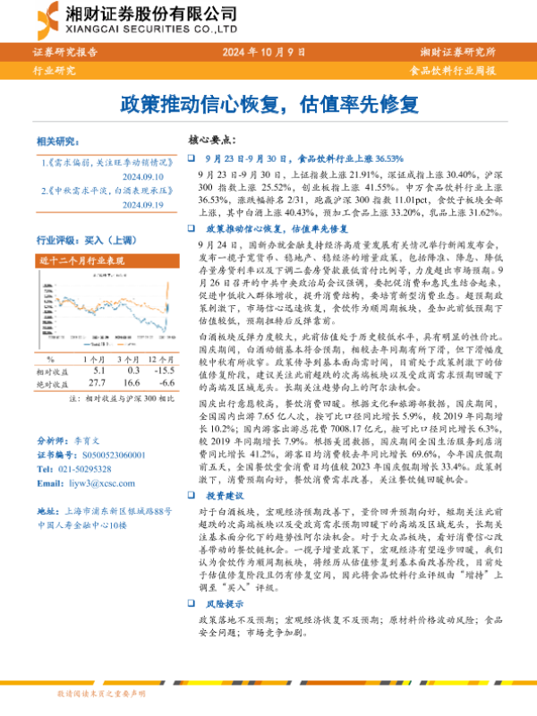 【湘财证券】【20241009】20241009-湘财证券-食品饮料行业周报:政策推动信心恢复,估值率先修复-11页