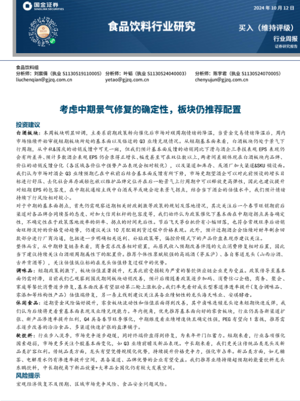 【国金证券】【20241012】20241012-国金证券-食品饮料行业周报:考虑中期景气修复的确定性,板块仍推荐配置-10页